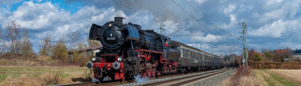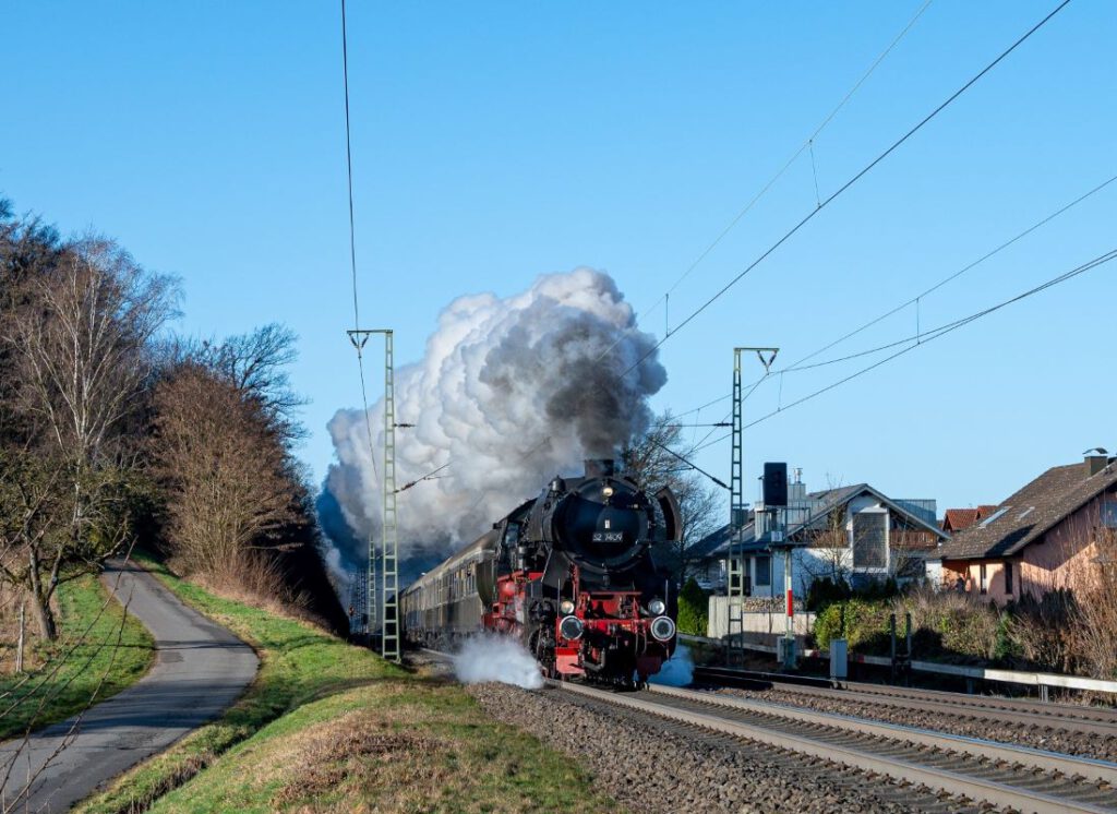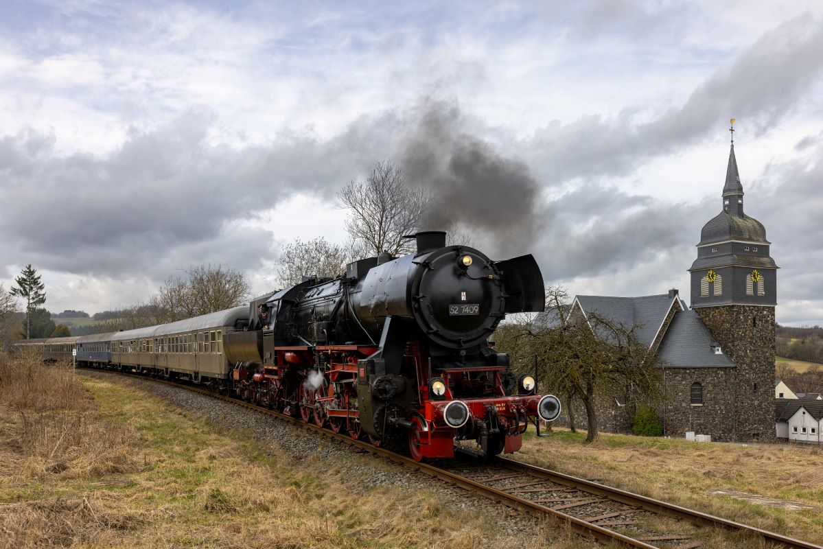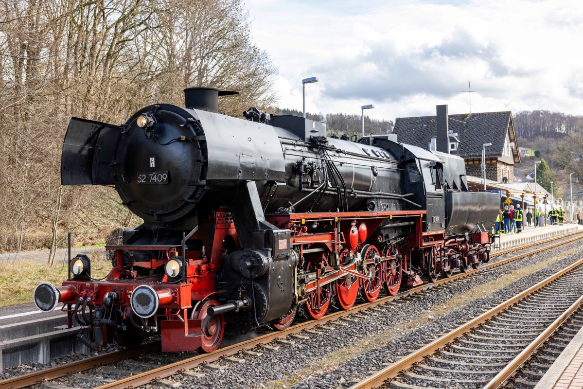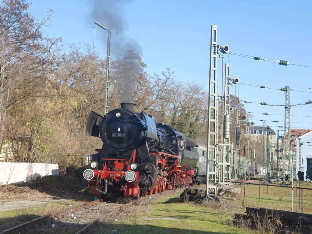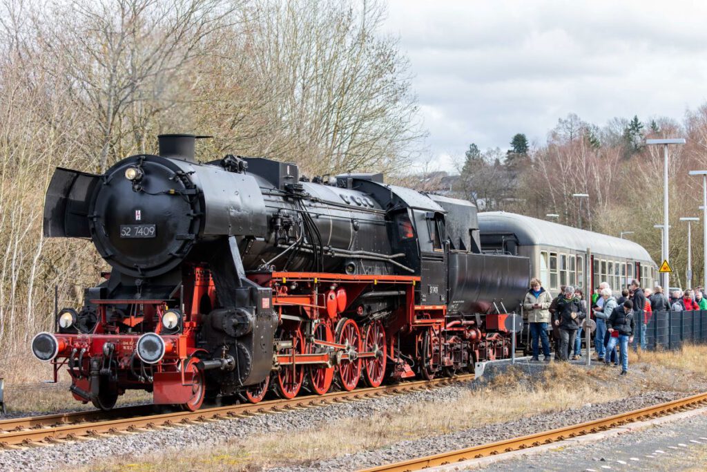 An gleich zwei Fahrtagen ging es mit der Würzburger Güterzug-Dampflok 52 7409 auf die Strecke. Nach rd. 15 Jahren Abstellzeit ist diese imposante Maschine endlich wieder im Dienst! Der Sonderzug bestand aus vier klassischen Eilzugwagen Bn “Silberling” im Originalzustand und einem Speisewagen.