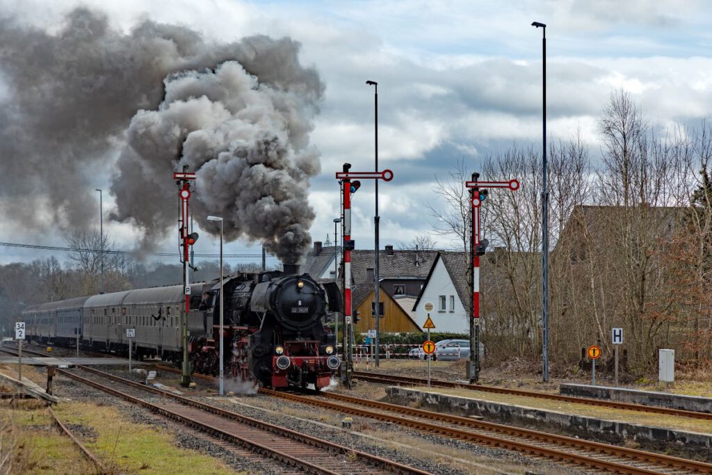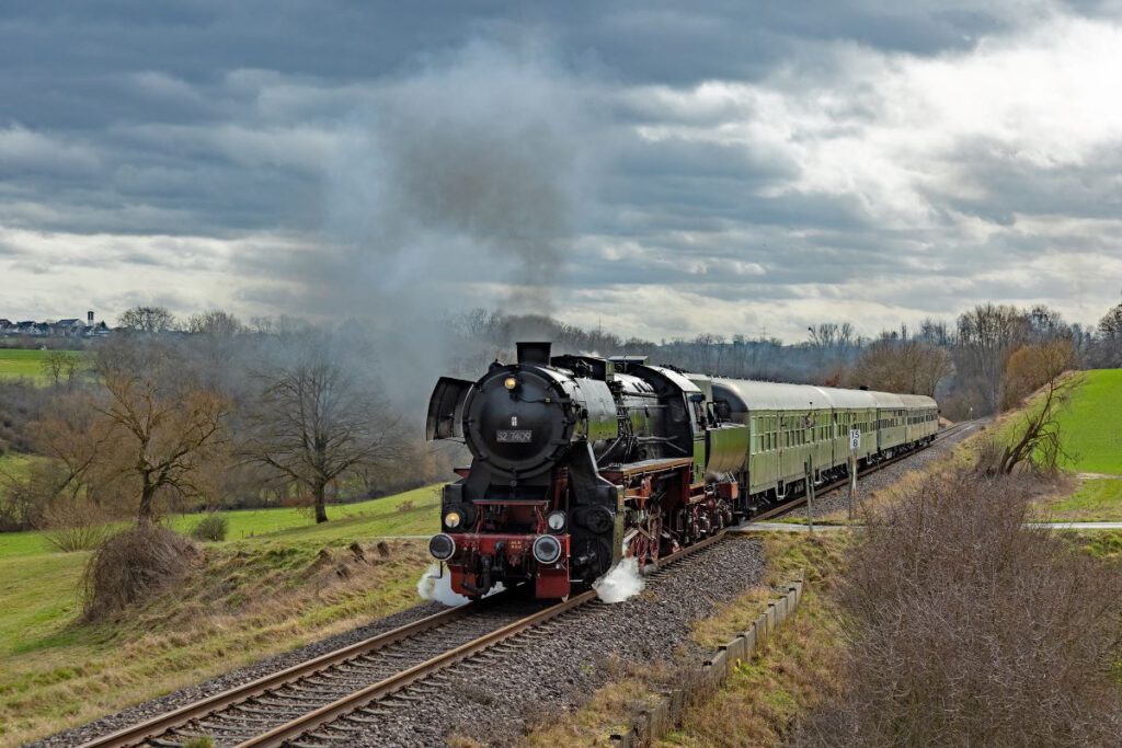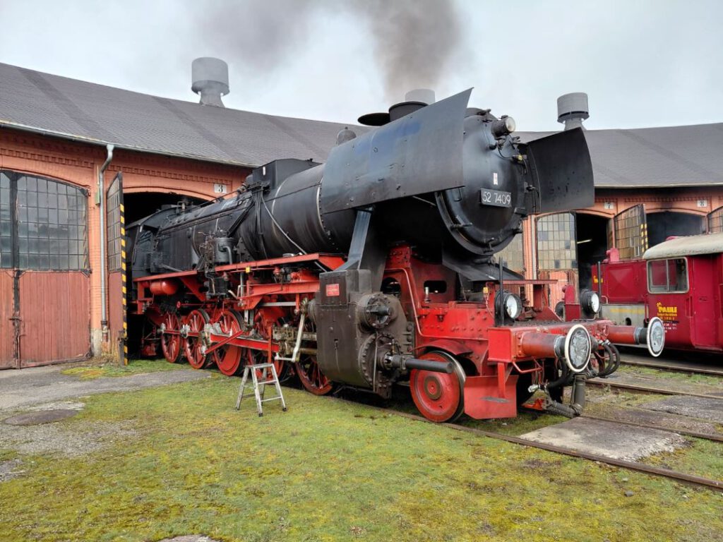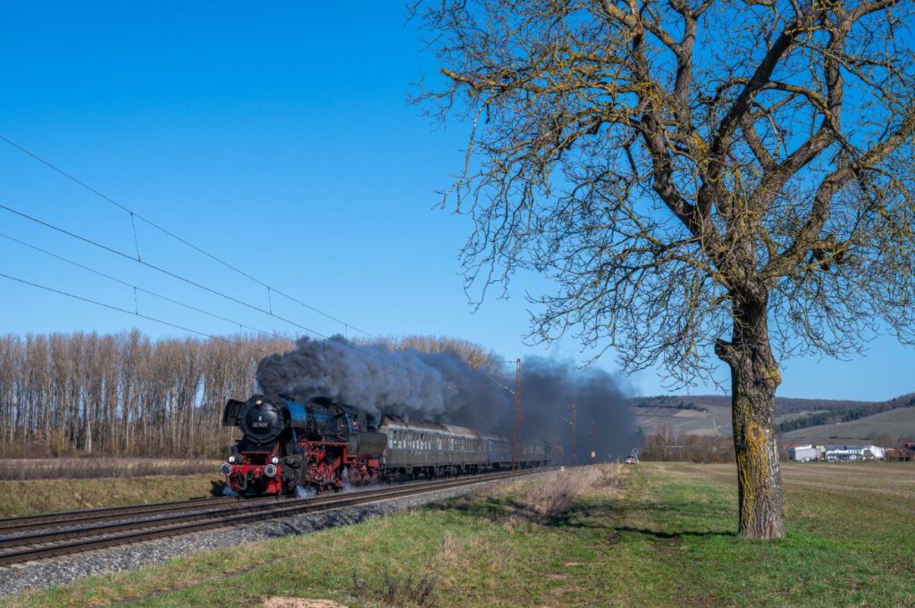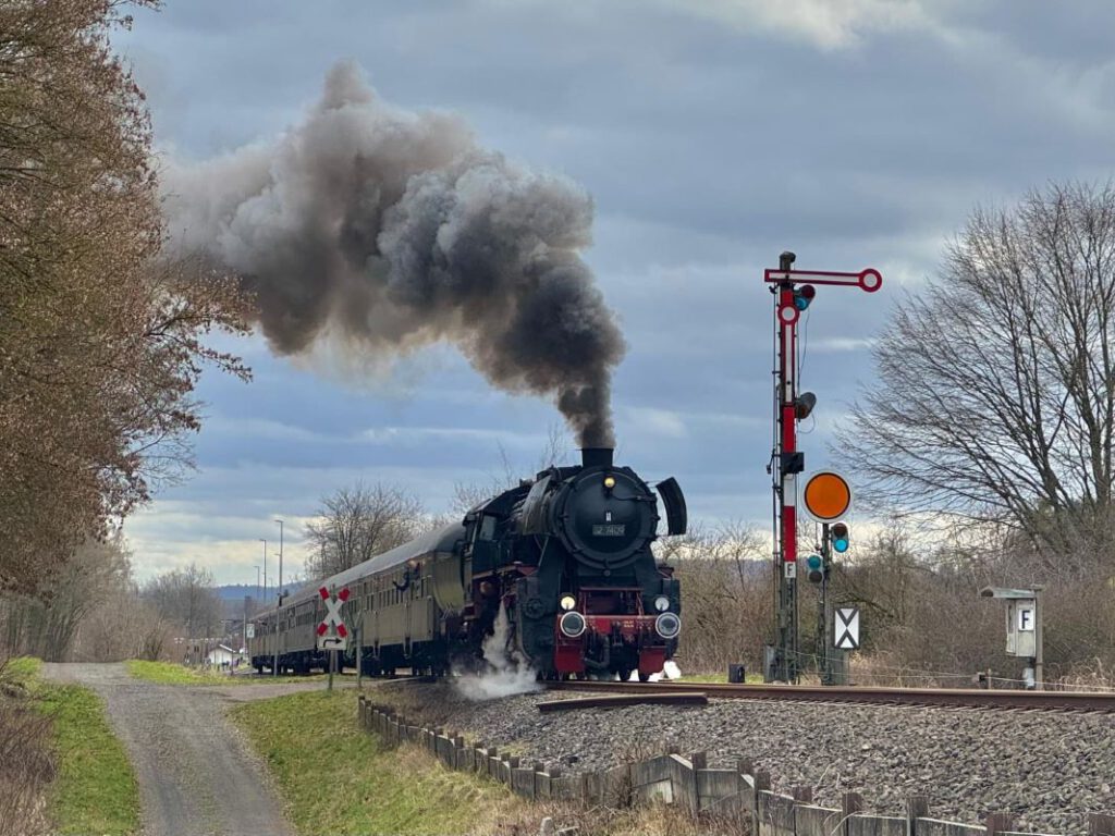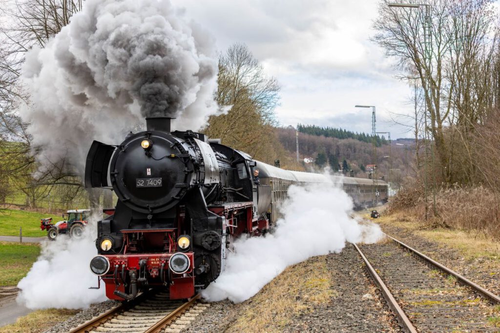 An gleich zwei Fahrtagen ging es mit der Würzburger Güterzug-Dampflok 52 7409 auf die Strecke. Nach rd. 15 Jahren Abstellzeit ist diese imposante Maschine endlich wieder im Dienst! Der Sonderzug bestand aus vier klassischen Eilzugwagen Bn “Silberling” im Originalzustand und einem Speisewagen.